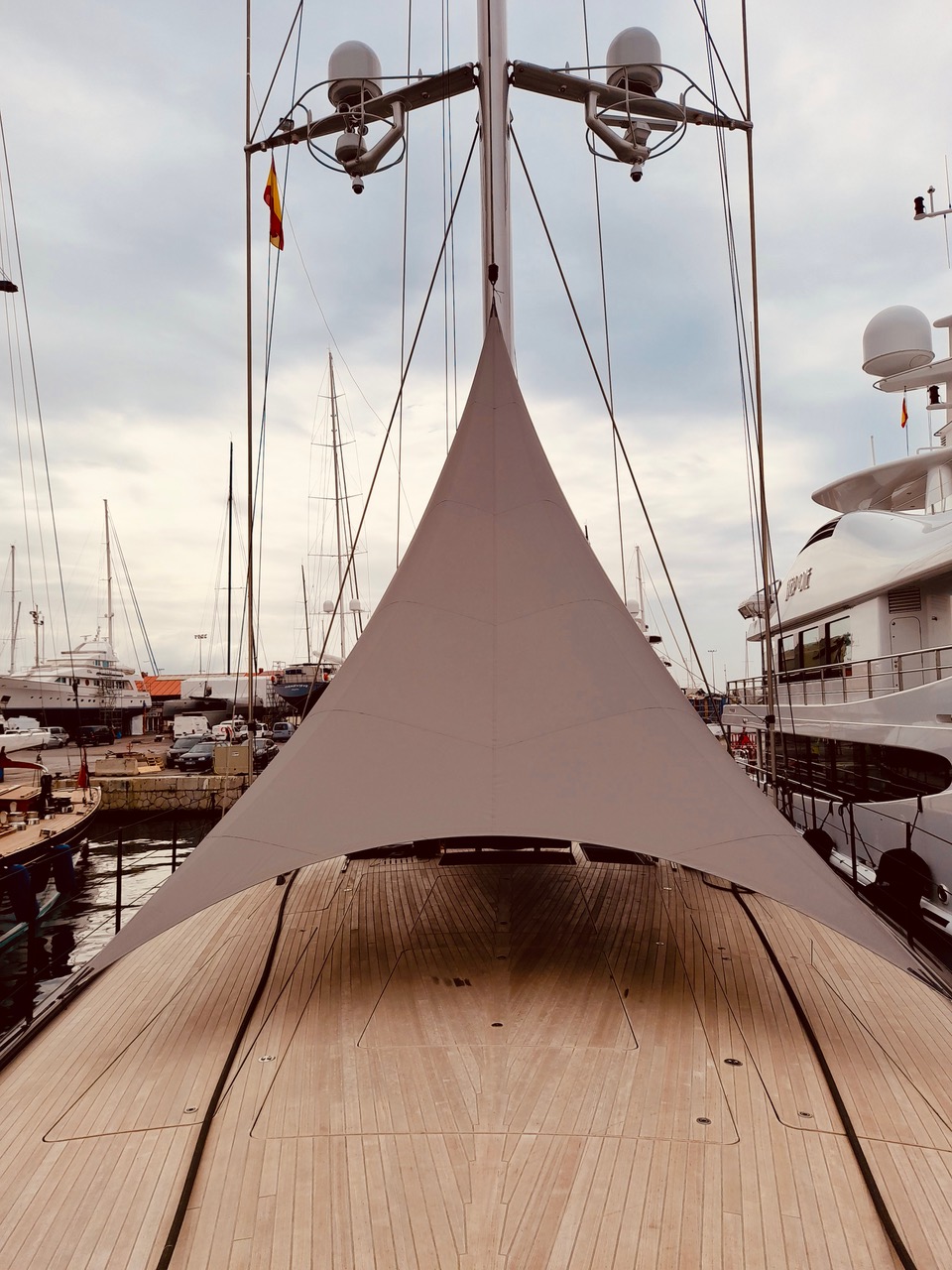 This is the first high peak foredeck ‘tent’ awning, that we refer to as our Bedouin style, which we installed earlier this month onto a 46m sloop.