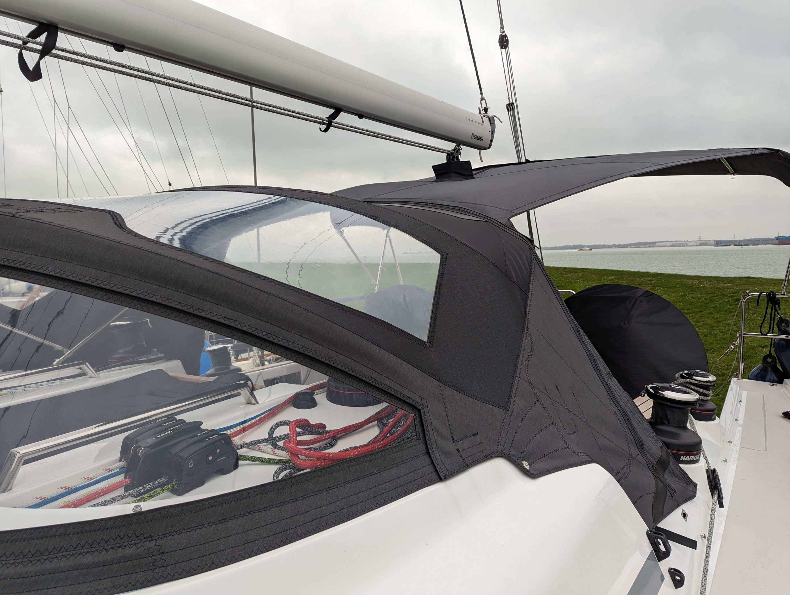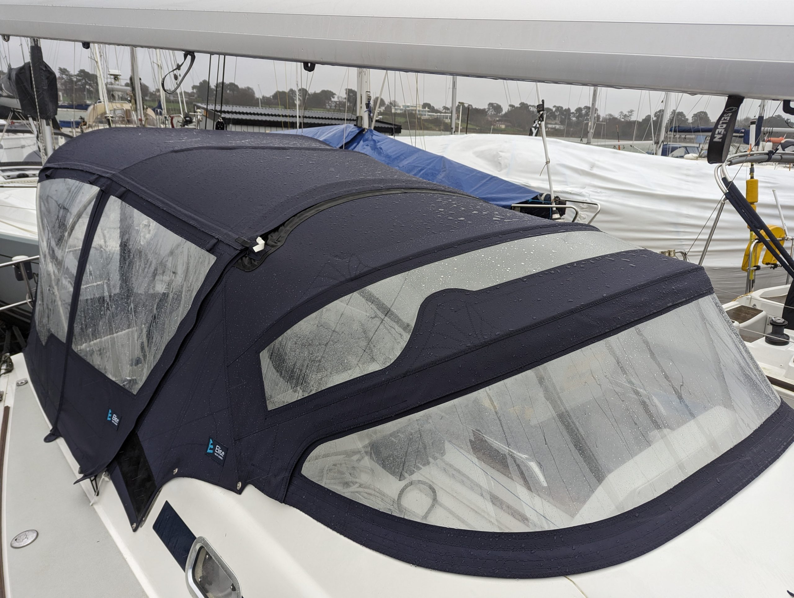 Arcona 465 overboom tensile awning, sprayhood enclosure with helm bimini in WeatherMAX80 Captain Navy