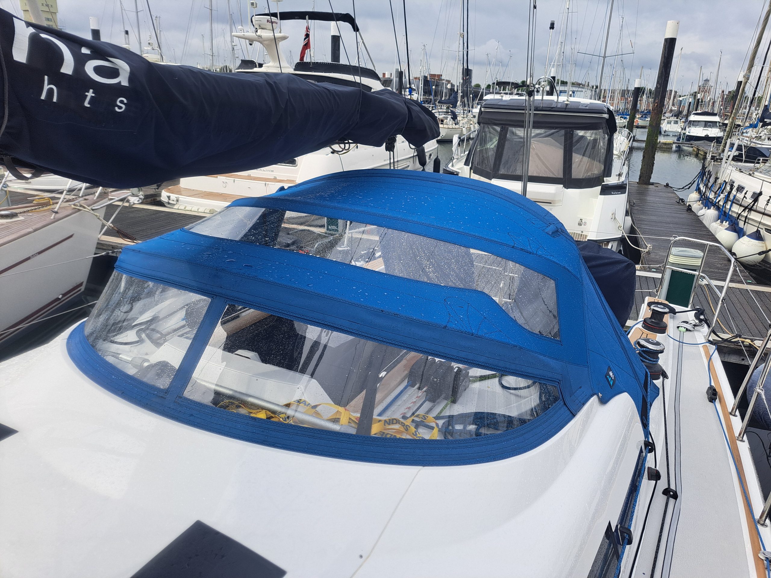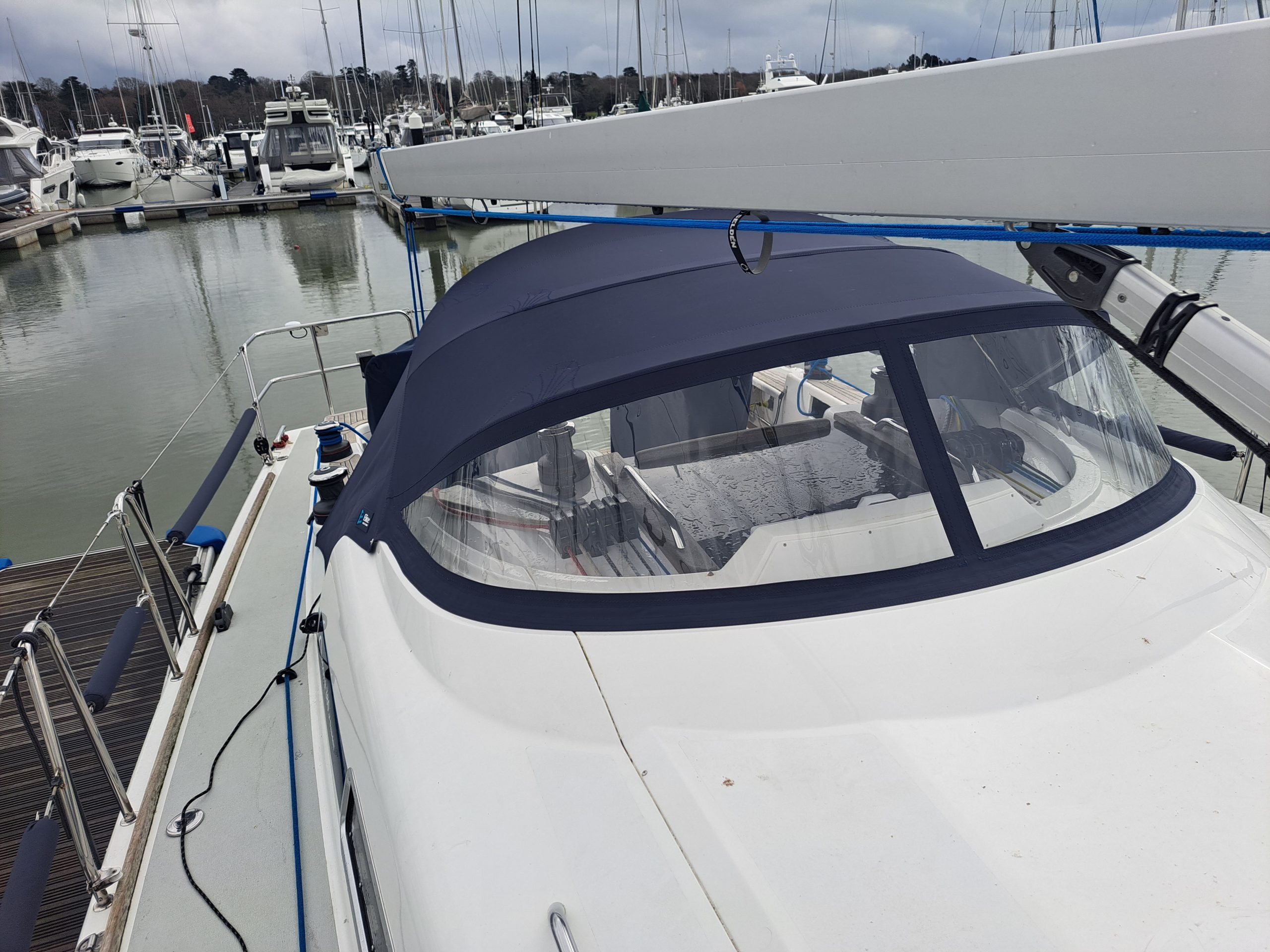 Arcona 430 sprayhood in WeatherMAX80 Captain Navy with leather grab patch