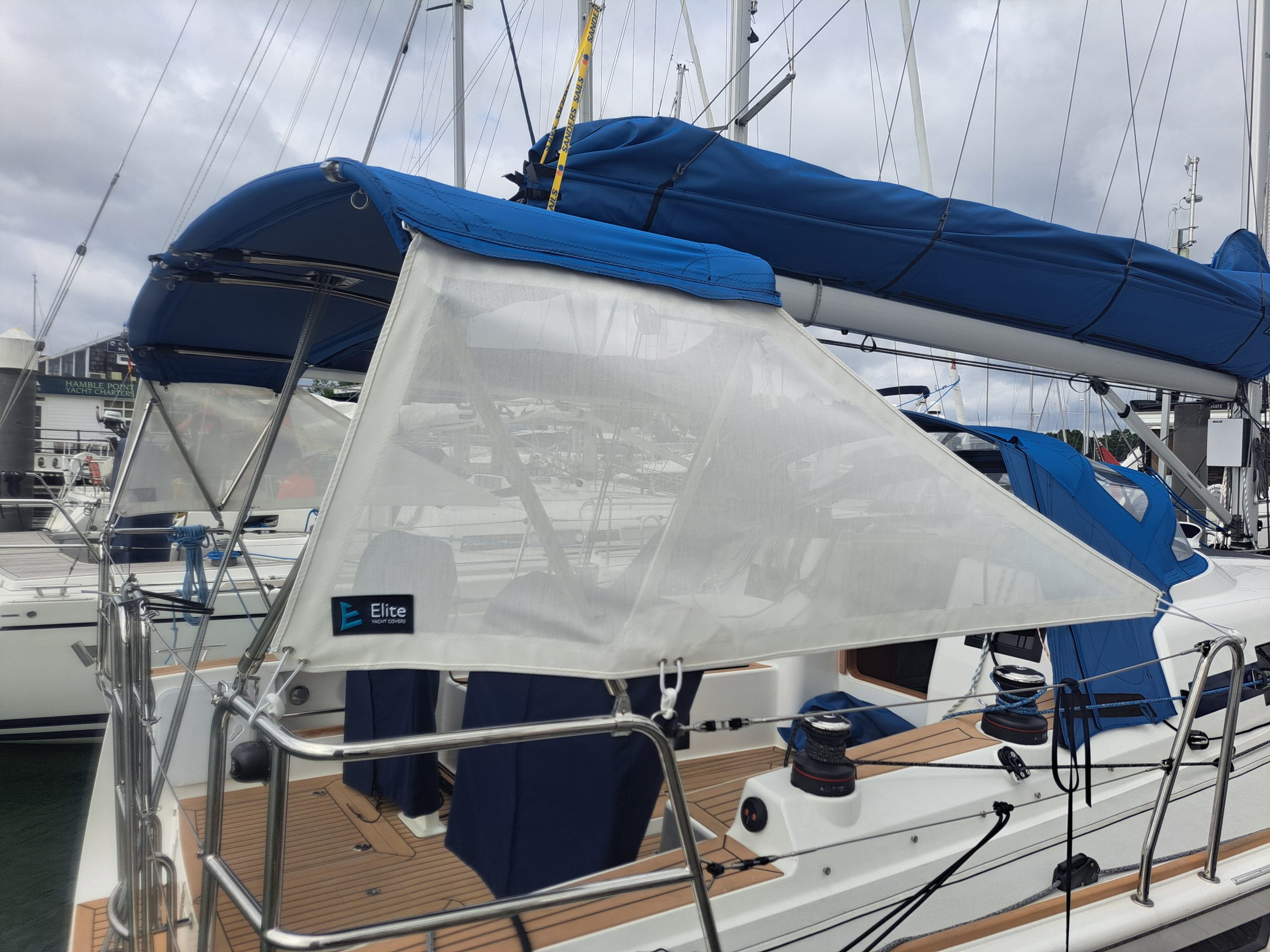 Arcona 465 overboom awning tensile awning & helm bimini in WeatherMAX80 Captain Navy with mesh sides & aft panel in Soltis86