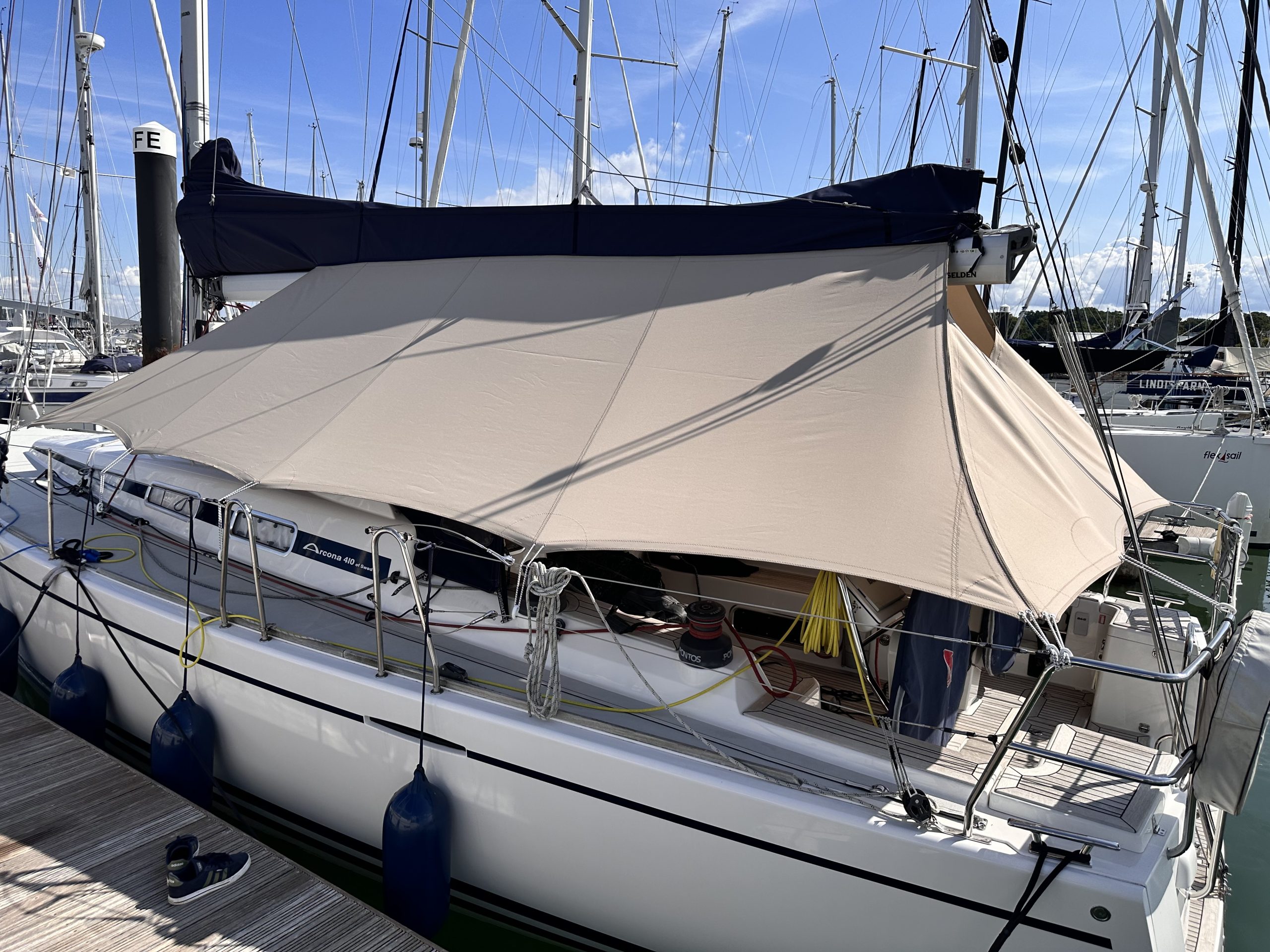 Arcona 410 stackpack awnings with aft panel in 1s Tan