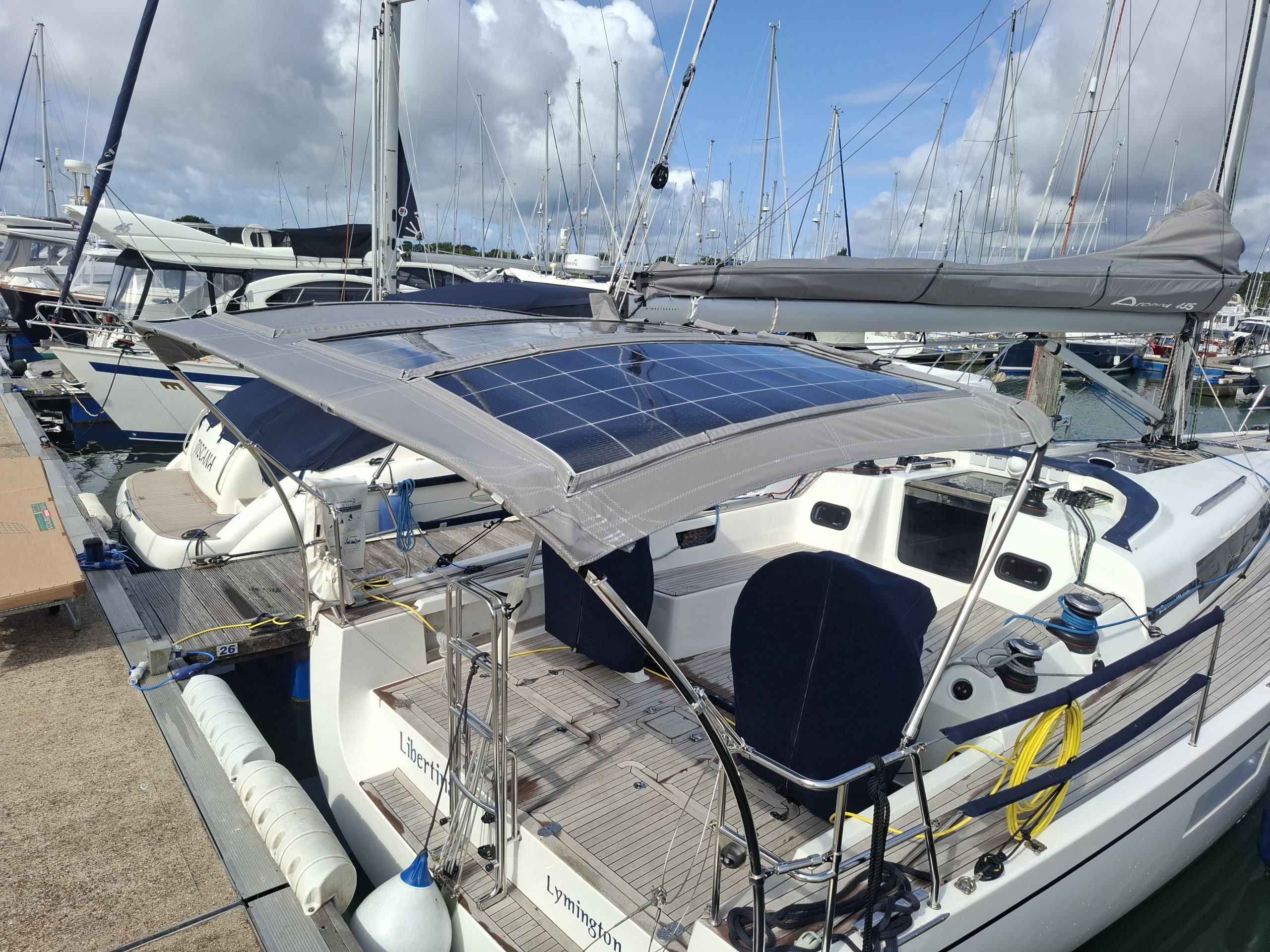 Arcona 435 solar bimini with custom frameworks in WeatherMAX80 Light Charcoal