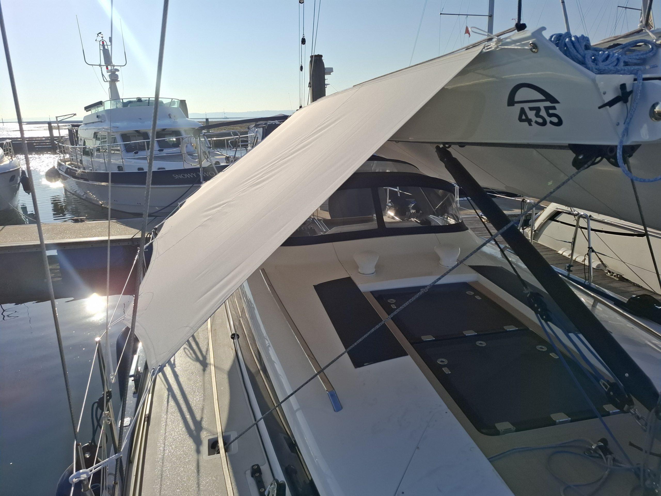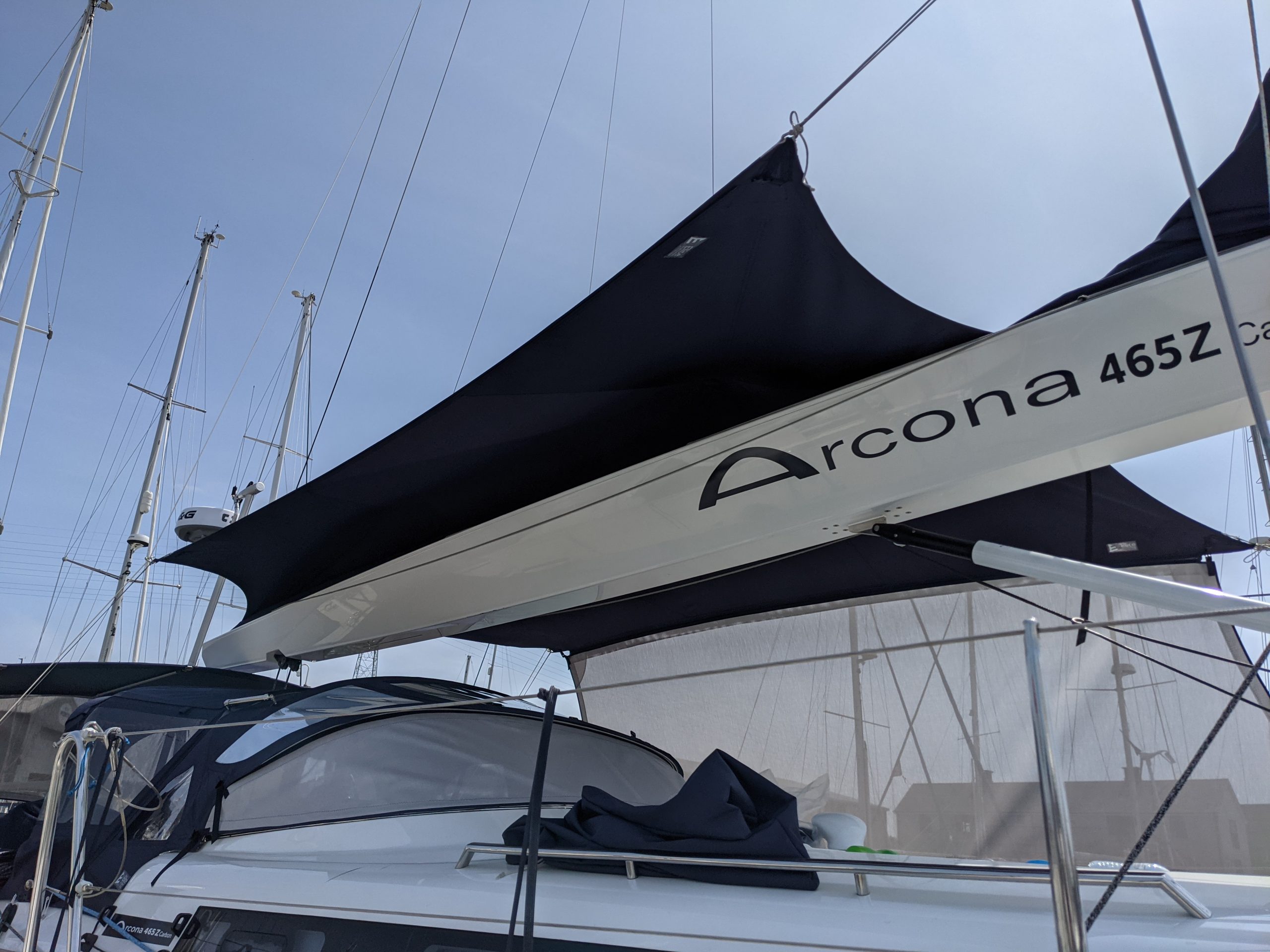 Arcona 465 overboom tensile awning in WeatherMAX80 Captain Navy