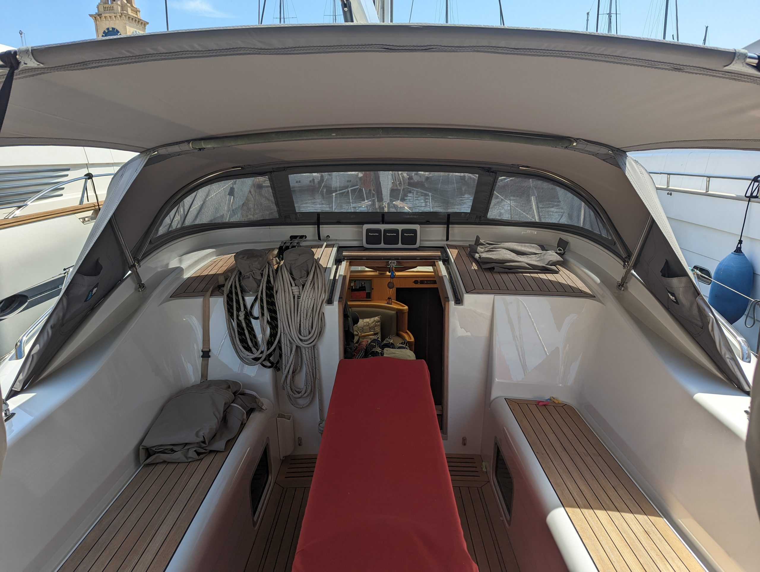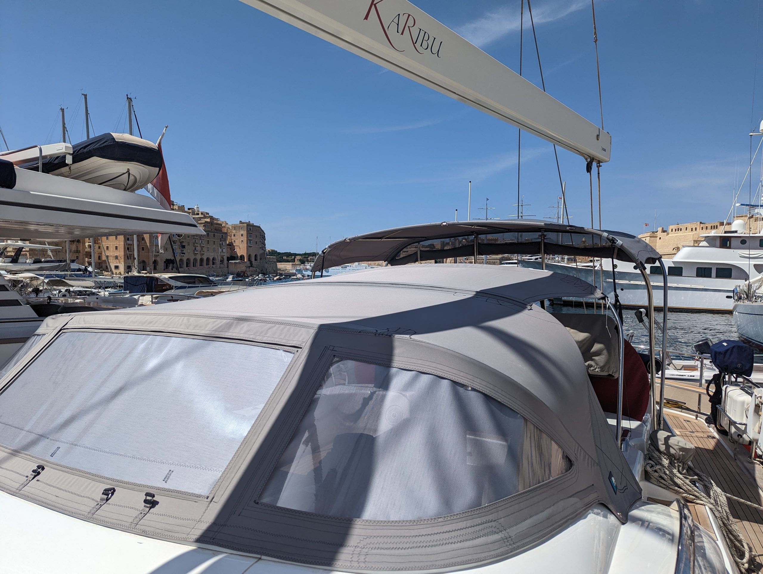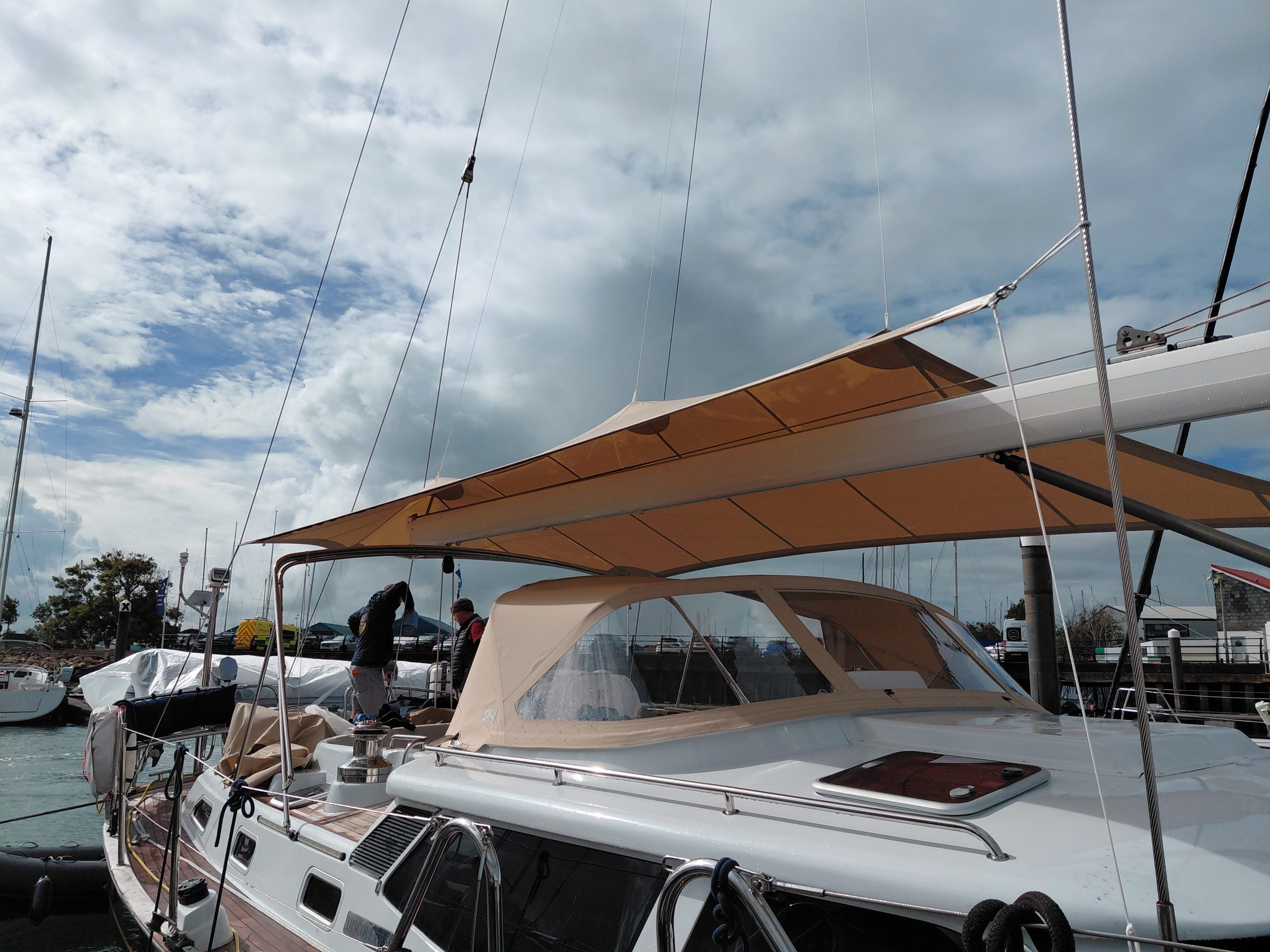 Discovery 55 WeatherMAX80 sprayhood and overboom tensile awning