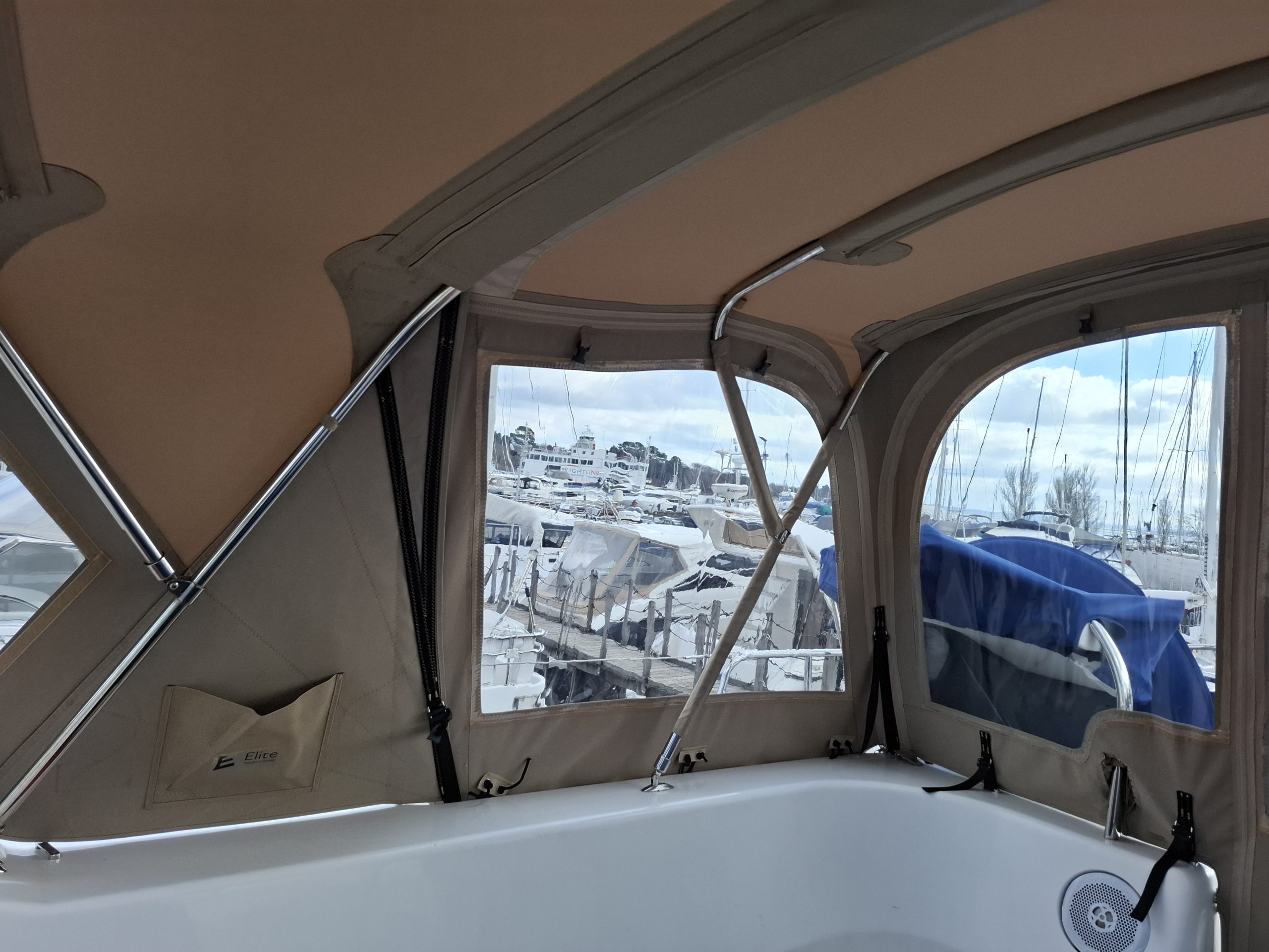 Discovery 57 WeatherMAX80 Sandstone Heather sprayhood interior with pocket
